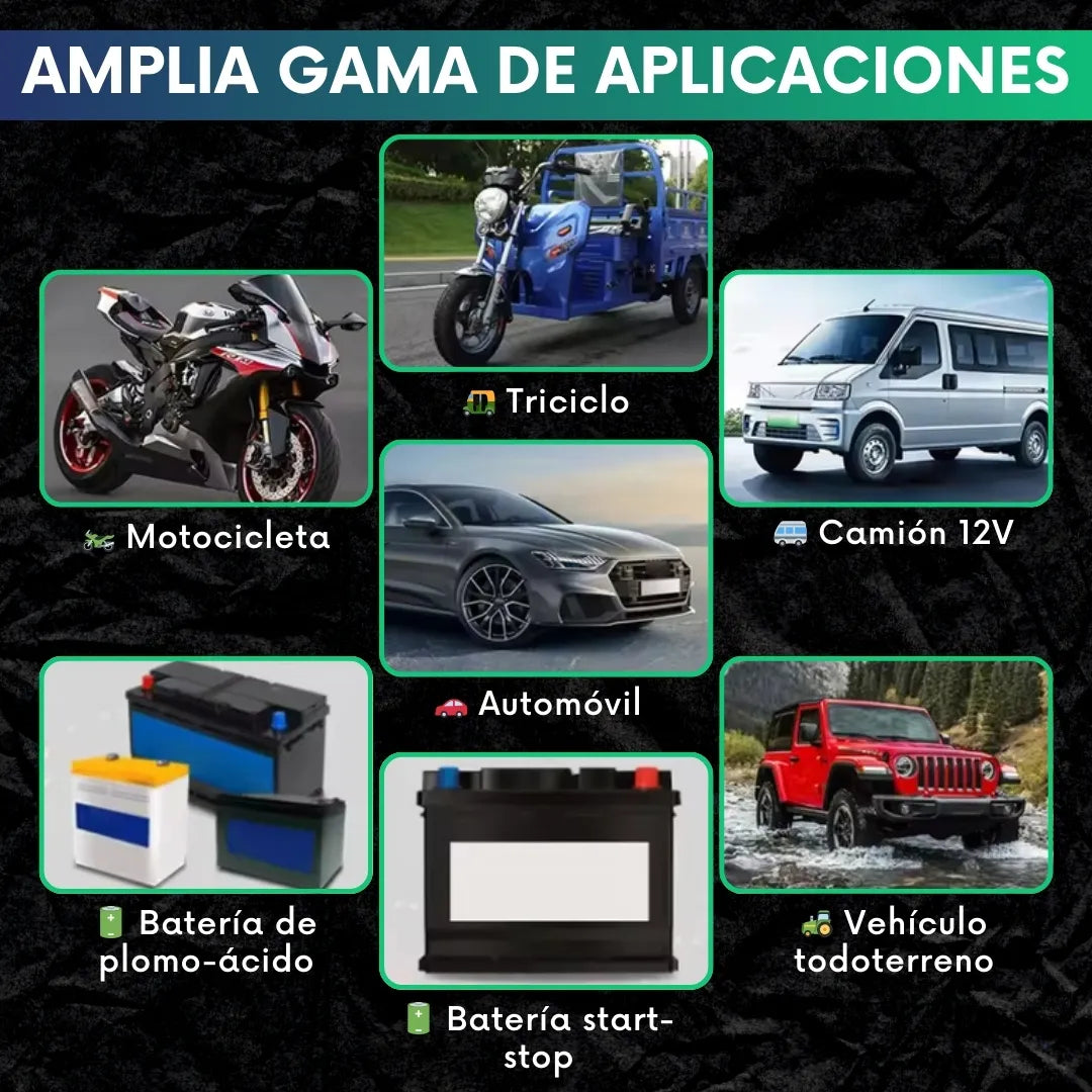 Diseñado para todo tipo de vehículos de 12V, este cargador es compatible con autos, motos, camionetas y más.