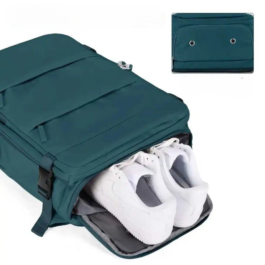 Es un espacio inteligente. Si metes zapatos, ocupa espacio. Si no metes zapatos, la tela es flexible y recuperas todo ese espacio para el compartimento principal.